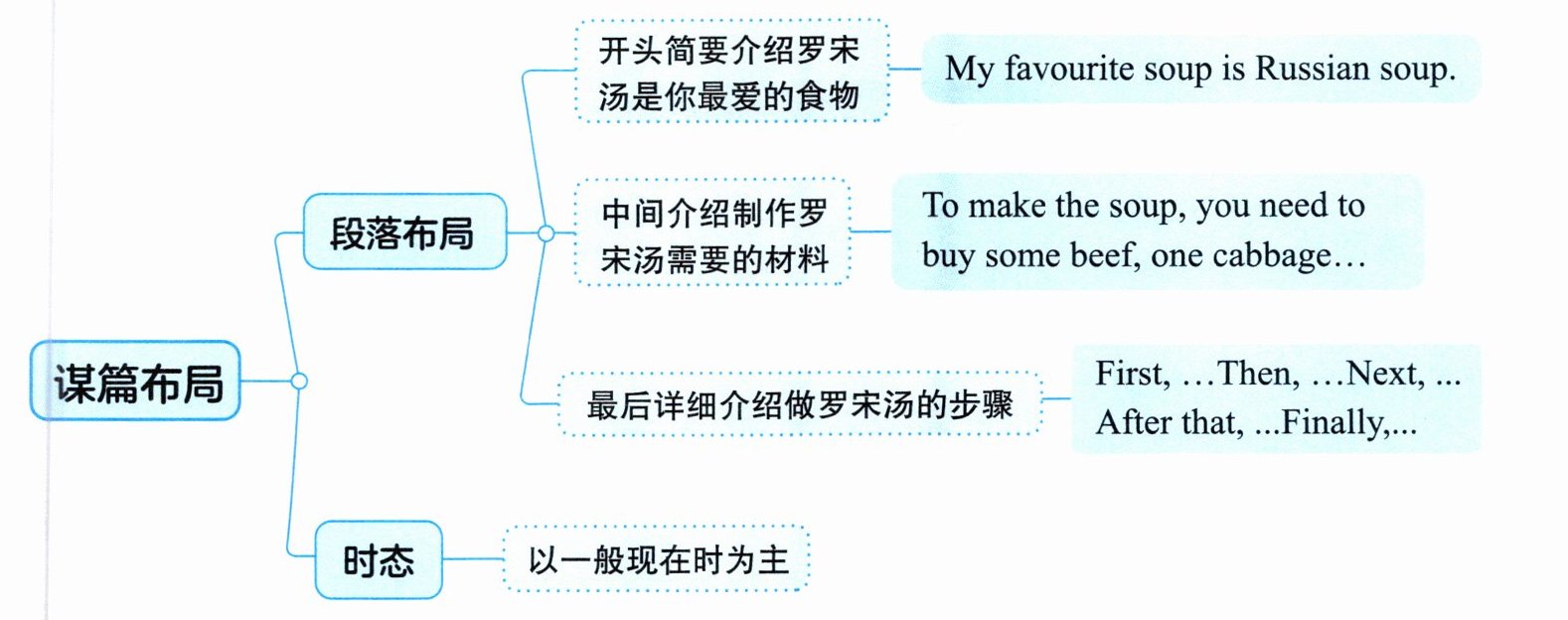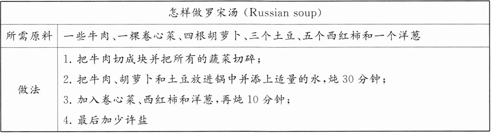 根据下面的表格提示写一篇英语短文,介绍一下罗宋汤的做法,不少于80词,可适当发挥。