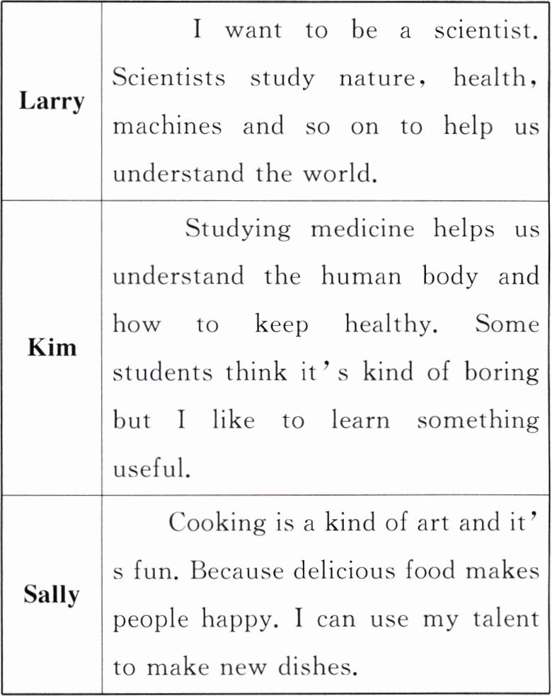 | Larry | I want to be a scientist. Scientists study nature, health, machines and so on to help us understand the world. |