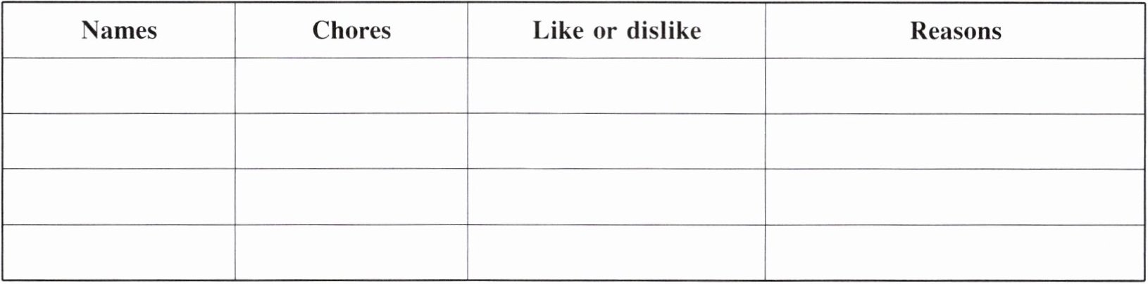 | Jack | Sweep the floor | Like | It keeps the house clean. |