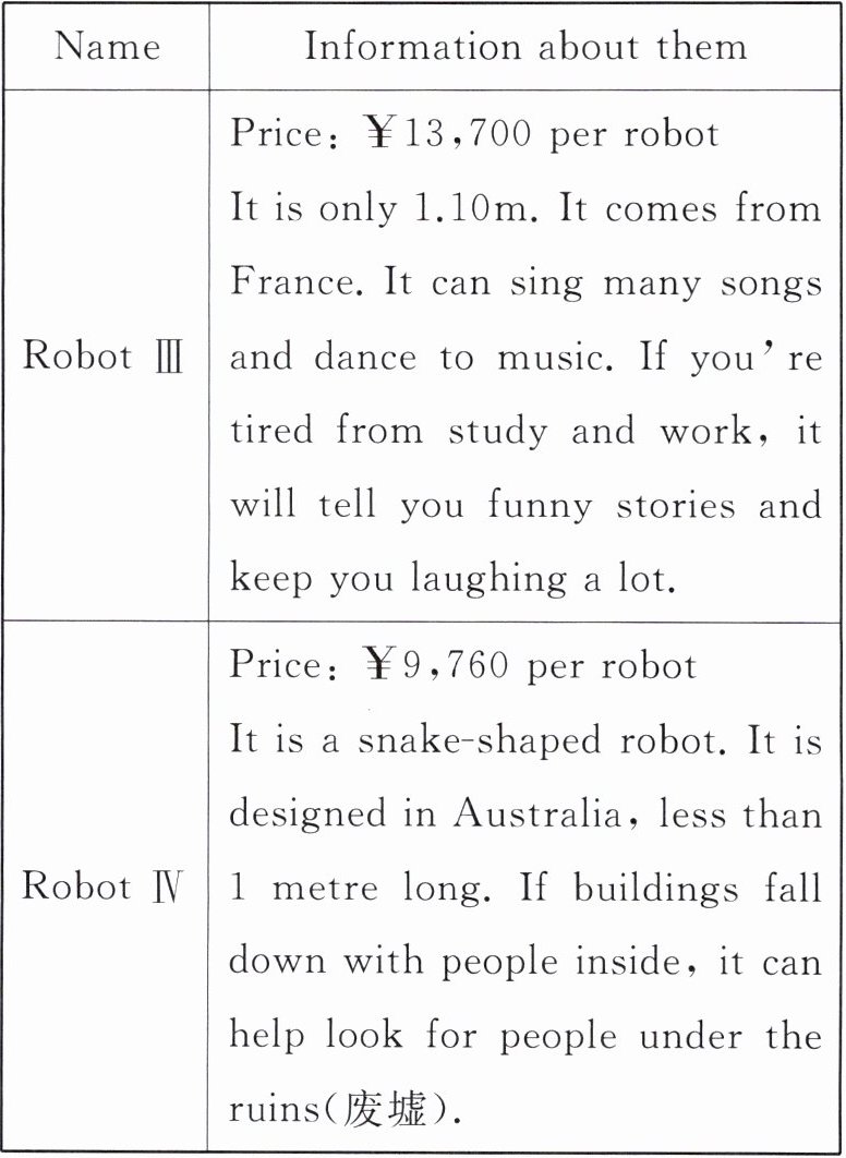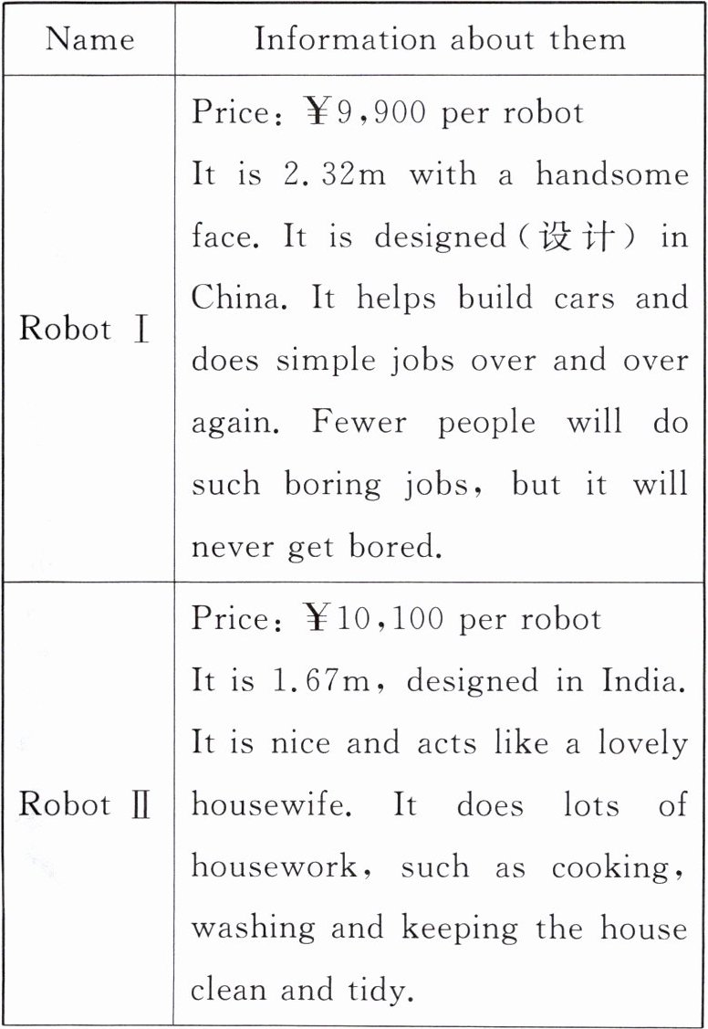 |Robot Ⅰ|Price:¥9,900 per robotIt is 2.32m with a handsome face. It is designed(设计)in China. It helps build cars and does simple jobs over and over again. Fewer people will do such boring jobs,but it will never get bored.|