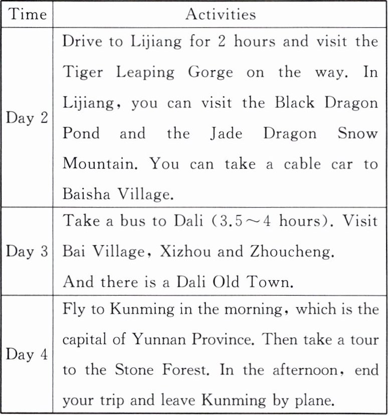 | Day 4 | Fly to Kunming in the morning, which is the capital of Yunnan Province. Then take a tour to the Stone Forest. In the afternoon, end your trip and leave Kunming by plane. |