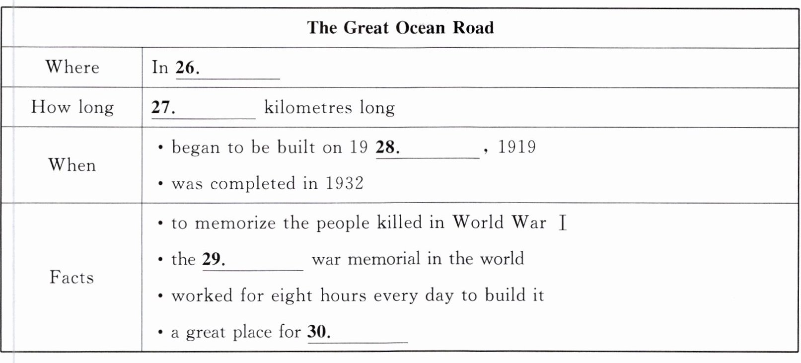 | Facts | • to memorize the people killed in World War Ⅰ• the 29.______ war memorial in the world• worked for eight hours every day to build it• a great place for 30.______ |