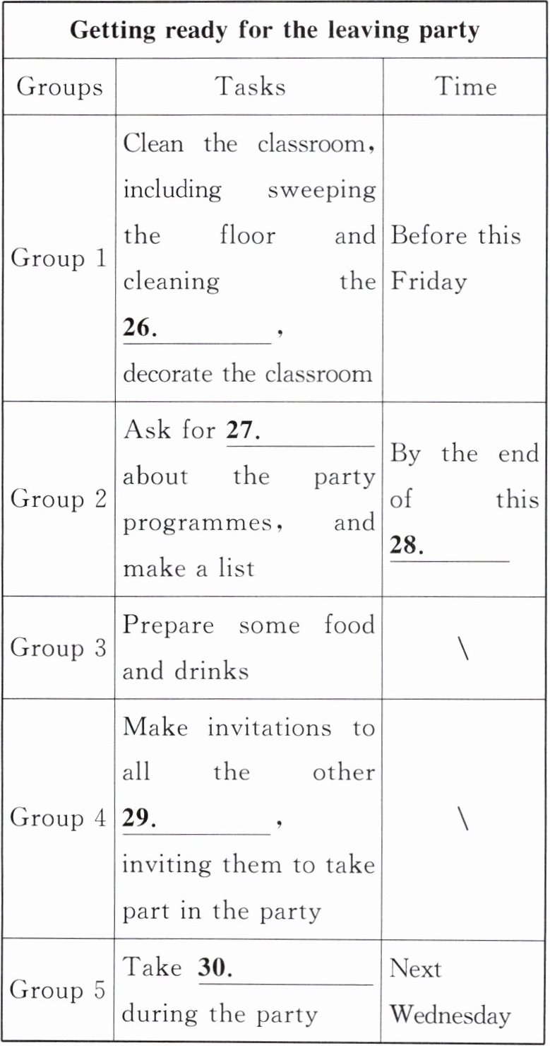 |Group 2|Ask for 27. ______ about the party programmes,and make a list|By the end of this 28. ______|