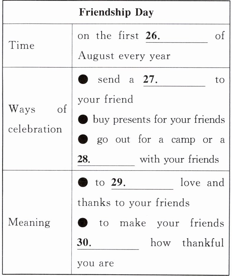 |Ways of celebration|send a 27. ______ to your friendbuy presents for your friendsgo out for a camp or a 28. ______ with your friends|
