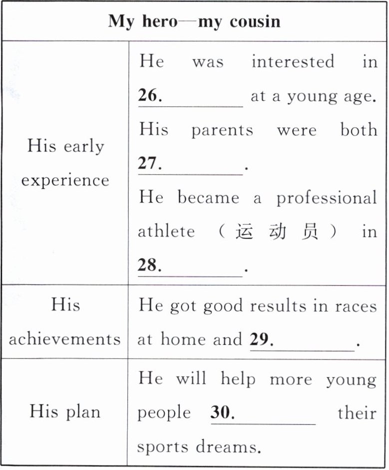 | His early experience | He was interested in 26. ______ at a young age. His parents were both 27. ______. He became a professional athlete (运动员) in 28. ______. |