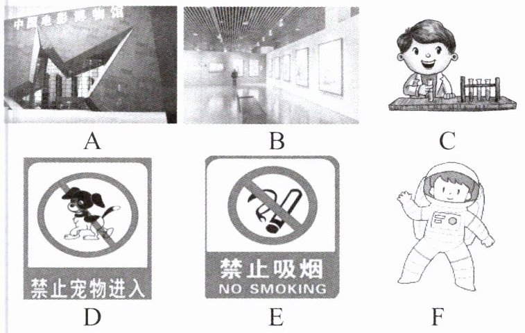 听五个句子,选出与所听句子内容相符的图片,有一个选项是多余的。读两遍。