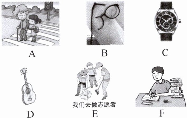 听五个句子,选择与所听句子内容相符的图片,有一幅图是多余的。读两遍。