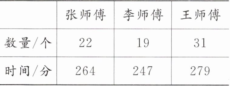 264÷22=12(分钟) 247÷19=13(分钟) 279÷31=9(分钟) 王师傅的工作效率最高