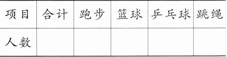 |项目|合计|跑步|篮球|乒乓球|跳绳|