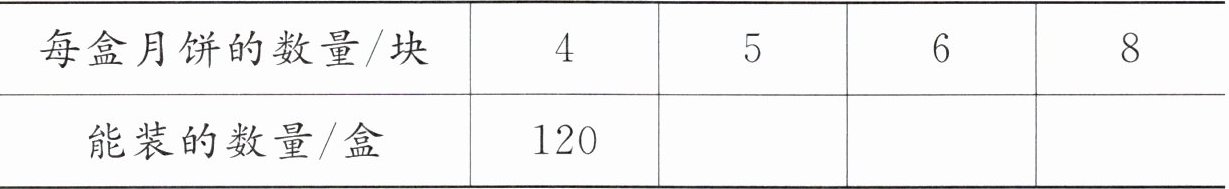 4. 有一批月饼需要包装,如果每盒装 4 块,可以装 120 盒。如果每盒装 5 块、6 块、8 块呢?完成下面的表格。