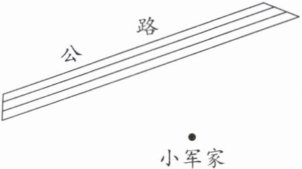 7. 大河乡积极贯彻落实党的二十大报告中关于“全面推进乡村振兴”的精神,准备从小军家门前修一条路通到公路,并使它的距离最短,应该怎样修?请在图上画一画。