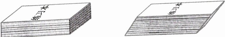 4. 先把 20 本练习本摞成一个长方体(如下左图),其前面为一个长方形;再把这摞练习本均匀地斜放(如下右图),这时前面变成了一个近似的平行四边形。这个长方形的面积与这个平行四边形的面积相比较,( )。