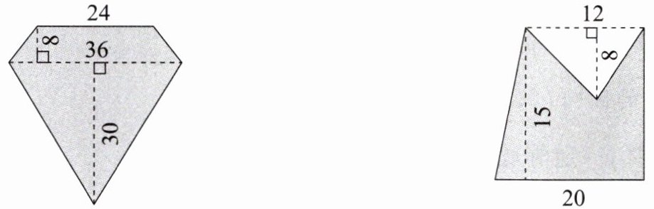 (24+36)×8÷2+36×30÷2=780(平方厘米) (12+20)×15÷2-12×8÷2=192(平方厘米)