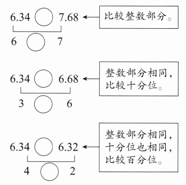 快乐导航 1. 比较小数的一般方法:先比较整数部分,整数部分大的小数就( );如果整数部分相同,就比较( )部分,从十分位开始,如果十分位上的数字相同,就比较百分位……依次比较。