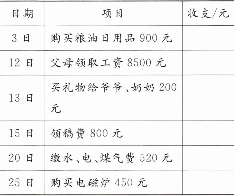 4. 下表是小红家 12 月份收入支出记录,请你在收支一栏用正数或负数表示。