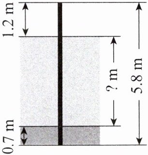 2. 如下图,将一根$5.8$米长的铁管竖直插入池塘中。铁管入泥的部分是$0.7$米,露出水面的部分是$1.2$米。池塘中的水深多少米?