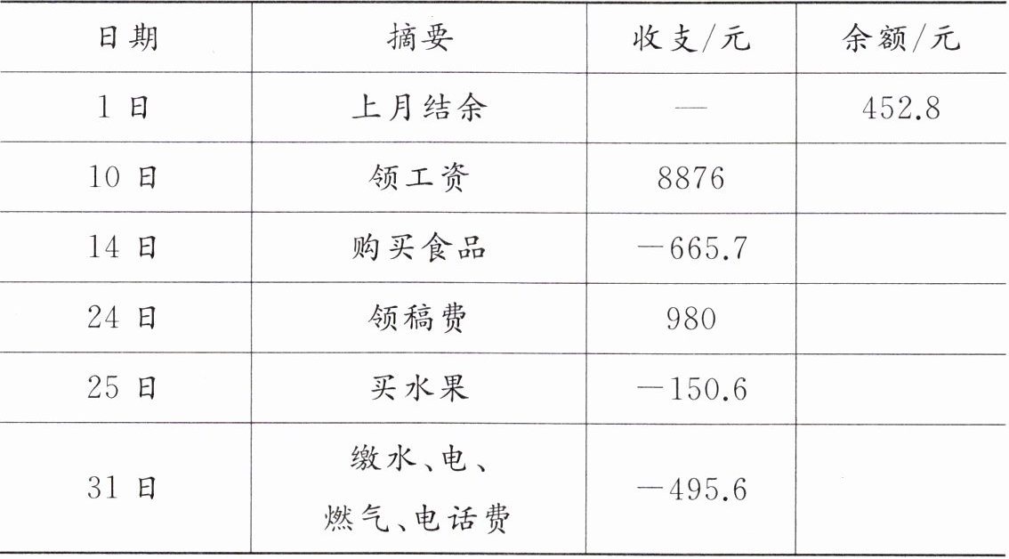 |31日|缴水、电、燃气、电话费|—495.6| |
