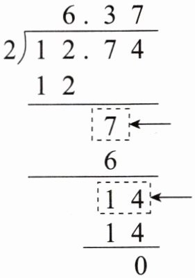 3. 乐乐花 12.74 元买了 2 支牙刷,平均每支牙刷多少元?右边的除法竖式中,箭头所指的“7”和“14”分别表示( )。