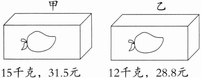 甲:31.5÷15=2.1(元) 乙:28.8÷12=2.4(元) 2.1<2.4,甲种芒果便宜,每千克便宜:2.4 - 2.1=0.3(元)