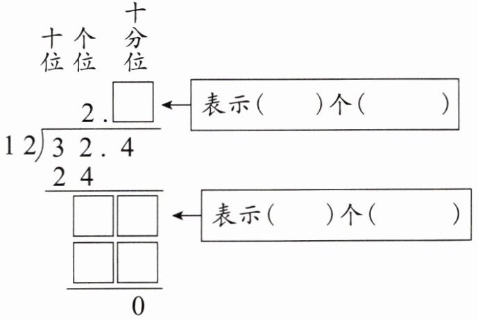 $□ ◯ □ =□( )\begin{array}{r} \overset{\begin{array}{r} 十 个 十\\ 位 位 分位\end{array} }{2.□ }\\ 12\enclose{longdiv}{3\ 2.4}\\ \underline{2\ 4}\\ □ □ \leftarrow $表示( )个( )\\ □ □ \\ _________$\\ 0\end{array}$