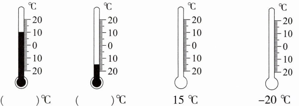 2. 写出左边两个温度计表示的温度,再在右边两个温度计上表示出相应的温度。
