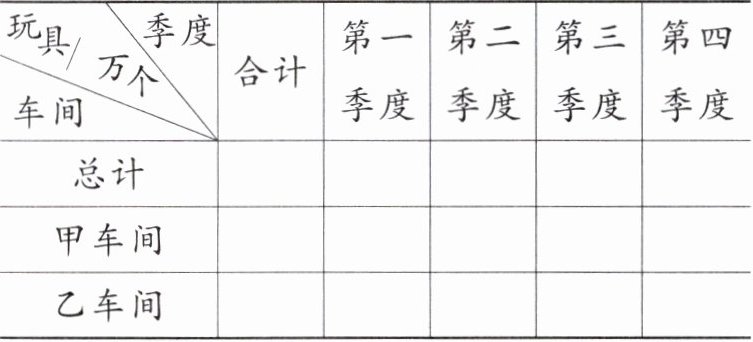 |玩具/万个 季度 车间|合计|第一季度|第二季度|第三季度|第四季度|