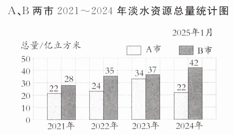 (2)A、B两市( )年的淡水资源总量差距最小。