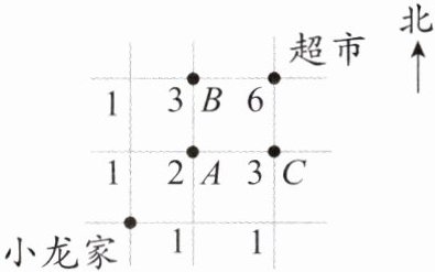 解答 如下图,从小龙家到点A有2种路线可以走,从小龙家到点B有3种路线可以走,从小龙家到点C有3种路线可以走,从小龙家到超市可以走的路线就是点B和点C上的数字之和。不同的路线一共有$3+3= 6$(种)。