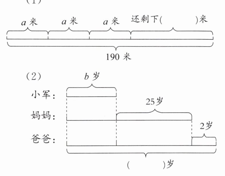 (2)修路队修路,已经修了$5$天,每天修$x$千米,还剩下$y$千米,这条路长( )千米。