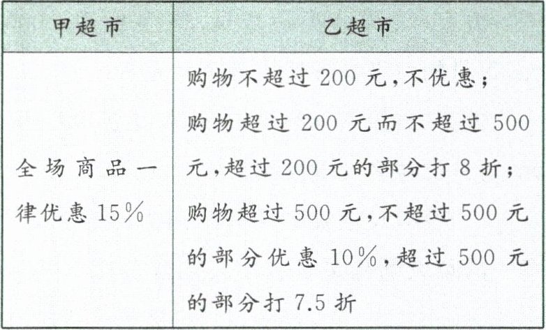(2)设购物金额为x元.当x<200或x=200时,显然两家超市的实际付款金额不相等.当200<x<500时,根据题意,得(1-15%)x=200+0.8(x-200).解得x=800,不符合前提条件.当x=500时,到甲超市实际付款500×(1-15%)=425(元),到乙超市实际付款200+(500-200)×0.8=440元,不符合题意.当x>500时,根据题意,得(1-15%)x=500(1-10%)+0.75(x-500).解得x=750.答:当购物金额为750元时,小华到两家超市实际付款金额相等.