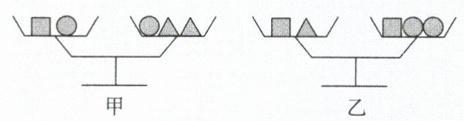 C 提示:设“△”的质量为z.根据甲天平,得$x+y=y+2z$①.根据乙天平,得$x+z=x+2y$②.根据等式的性质1,将方程①的两边减y,得$x=2z$③.根据等式的性质1,将方程②的两边减x,得$z=2y$④.根据等式的性质2,将方程④的两边乘2,得$2z=4y$.结合方程③,根据等式的传递性,得$x=4y$.