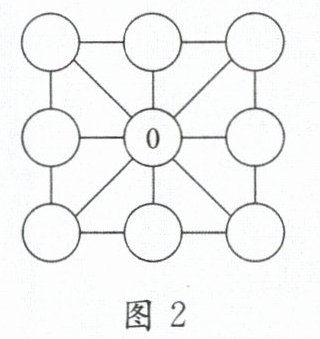 8. (1)如图 2,请你在圆圈内填上不同的有理数,使每条线上的 $ 3 $ 个数之和为 $ 0 $,写出一种情况即可。