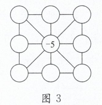 (2)如图 3,将中心处的 $ 0 $ 改为 $ -5 $,要使每条线上的 $ 3 $ 个数之和为 $ -15 $,应该怎样填数?试一试,写出一种情况即可。