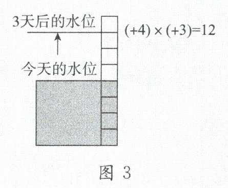 8. 如图3,水文观测中,常遇到水位的上升与下降问题。如果将今天的水位记为0cm,规定水位上升为正,水位下降为负,几天后为正,几天前为负,那么$(+4)×(+3)$的运算结果可表示水位每天上升4cm,3天后的水位。按上面的规定,$(-3)×(-2)$的运算结果可表示(