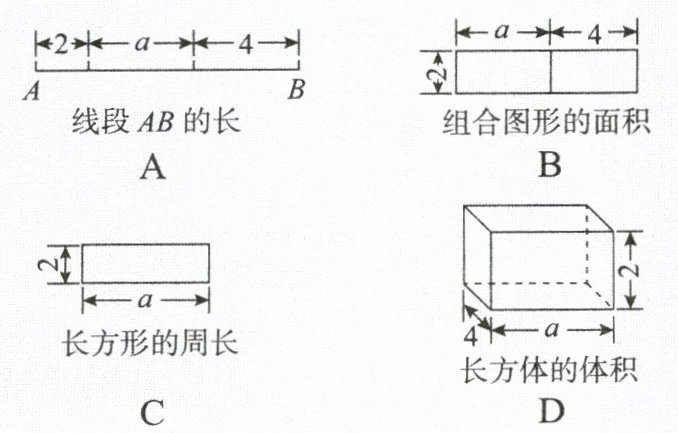 B 提示:选项A,线段AB的长为三条线段的和,即a+6.选项B,组合图形的面积为两个长方形面积的和,即2a+8.选项C,长方形的周长为2条长与2条宽的和,即2a+4.选项D,长方体的体积=长×宽×高,即8a.