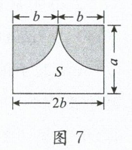6. 小红家中有一个长方形窗户(如图 7),窗帘是由半径相同的两个四分之一圆组成的,图 7 中透光面积(空白部分的面积)为 $ S $.请用含 $ a $,$ b $的代数式表示 $ S $,并求出当 $ a = 1.5 \, m $,$ b = 1 \, m $时,$ S $的值.($ \pi $取 $ 3.14 $)