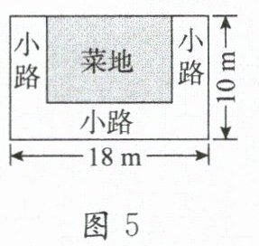 16. (14分)如图5,有一块长为$18m$,宽为$10m$的长方形土地,现将三面留出宽都是$x m(0 < x < 9)$的小路,余下的部分为菜地(阴影部分).