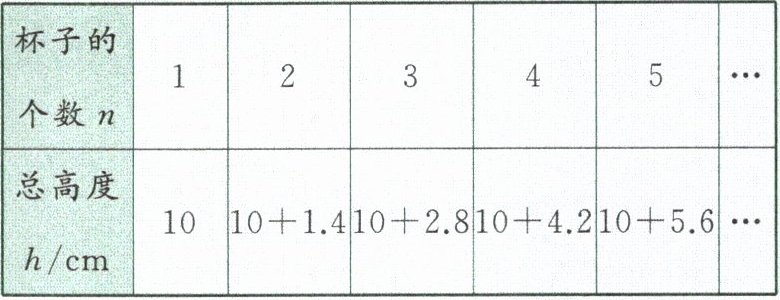 (1)由表格数据,得每增加1个杯子,总高度增加1.4cm,则h=[10+1.4(n-1)]cm.