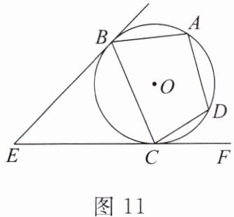 3. 如图 11,EB,EC 是⊙O 的两条切线,B,C 是切点,A,D 是⊙O 上两点。若∠E = 46°,∠DCF = 32°,则∠A =