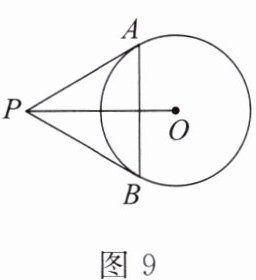1. 如图 9,从⊙O 外一点 P 引⊙O 的两条切线 PA,PB,A,B 为切点。若∠APB = 60°,PA = 8,则弦 AB 的长是(
