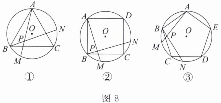7. 如图 8,已知正三角形 $ ABC $、正方形 $ ABCD $、正五边形 $ ABCDE $ 分别是 $ \odot O $ 的内接三角形、内接四边形、内接五边形,点 $ M $,$ N $ 分别从点 $ B $,$ C $ 出发,以相同的速度在 $ \odot O $ 上逆时针运动,连接 $ AM $,$ BN $ 交于点 $ P $。