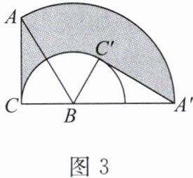 例2 如图3,在$\triangle ABC$中,$\angle ACB = 90^{\circ}$,$AB = 4$,$BC = 2$,将$\triangle ABC绕点B顺时针旋转到\triangle A'BC'$的位置,此时点$A'恰好在CB$的延长线上,则图中阴影部分的面积为______