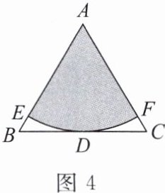 1. 如图4,在边长为2的等边三角形$ABC$中,$D是BC$边上的中点,以点$A$为圆心、$AD为半径作圆分别与AB$,$AC交于E$,$F$两点,则图中阴影部分的面积为(