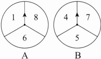 6. 如图,A,B是两个相同的转盘,均被分成三个面积相等的扇形,转盘A上的数字是1,6,8,转盘B上的数字是4,5,7。分别用力转动A,B两个转盘上的箭头,记下停止时箭头所指的数字(若箭头恰好停留在分界线上,则重新转动一次)。