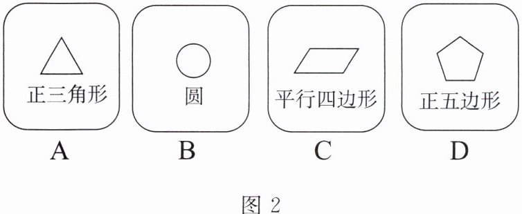 5. 如图2,有4张背面相同的纸牌A,B,C,D,其正面分别画有正三角形、圆、平行四边形、正五边形。小明把这4张牌背面向上洗匀后摸出1张,进行记录后,放回洗匀,再摸出1张。