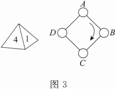 6. 如图3,一枚质地均匀的正四面体骰子的四个面分别标有数字1,2,3,4。正方形 $ ABCD $ 顶点处各有一个圈。跳圈游戏的规则如下:游戏者每掷一次骰子,骰子着地一面上的数字是几,就沿正方形的边顺时针连续跳几个边长。如:若从圈 $ A $ 起跳,第一次掷得3,就顺时针连续跳3个边长,落到圈 $ D $;若第二次掷得2,就从圈 $ D $ 开始顺时针连续跳2个边长,落到圈 $ B $······设游戏者从圈 $ A $ 起跳。