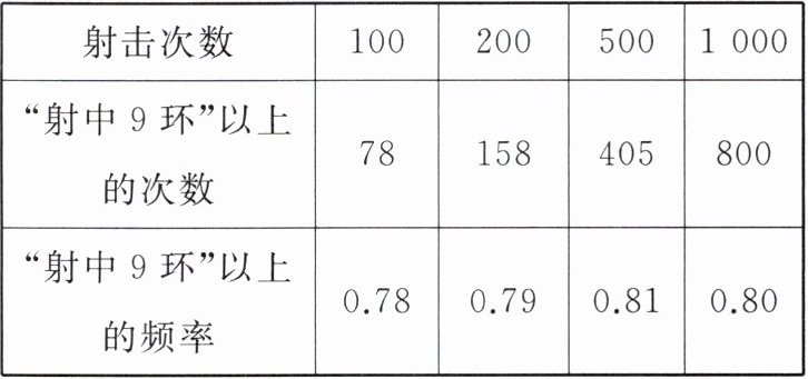 |“射中9环”以上的频率|0.78|0.79|0.81|0.80|
