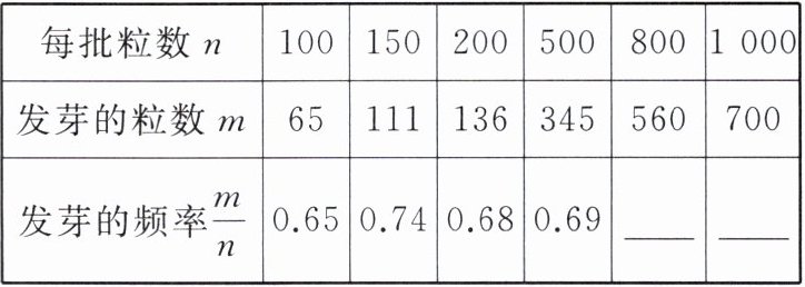 |发芽的频率$\dfrac{m}{n}$|0.65|0.74|0.68|0.69|