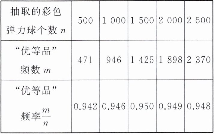 (1)因为当n越来越大时,"优等品"频率越来越稳定于0.95,所以这批彩色弹力球"优等品"概率的估计值为0.95.