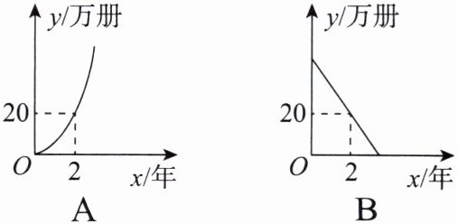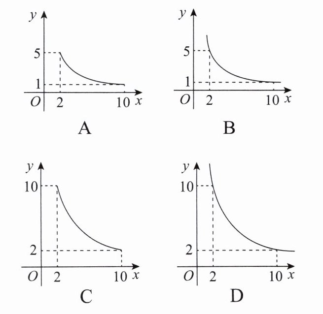 2. 一台印刷机每年可印刷的书本数量y(万册)与它的使用时间x(年)成反比例关系,当$ x = 2 $时,$ y = 20 $,则y与x的函数图象大致是(